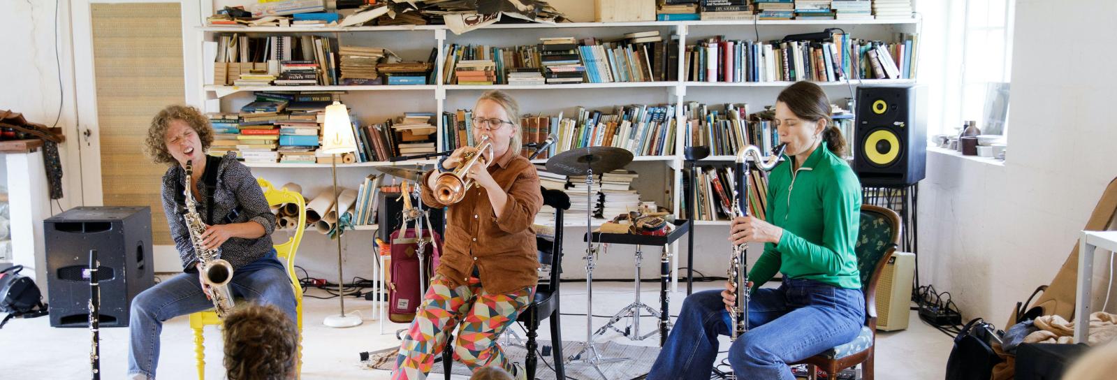 Tre af de stærkeste feminine instrumentalister fra den nordiske impro-scene spiller musik som er skrevet på alverdens måder. Pile, prikker, figurer og symboler bliver til musik for øjnene af eleverne og eleverne inviteres i en workshop før koncerten til selv at skabe små grafiske værker som trioen transformerer til musik. Kan du se det for dig?